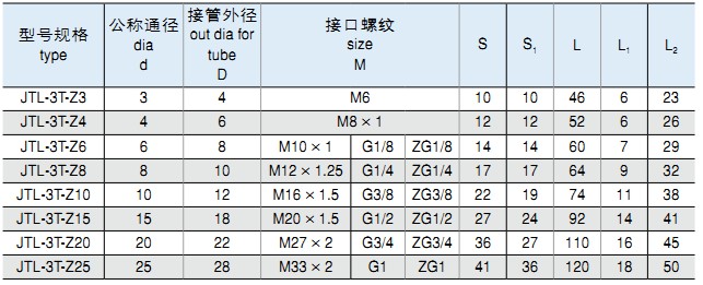 標記示例:①:卡套式三通終端管接頭 公稱通徑Ø6MM JT-3T-Z6 M10×1