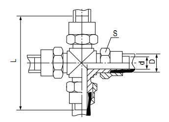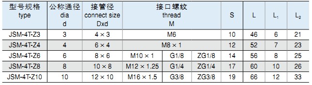 • 標(biāo)記示例: ①:鎖母式三通終端管接頭 公稱通徑 Ø6MM JSM-3T-Z6 M10×1