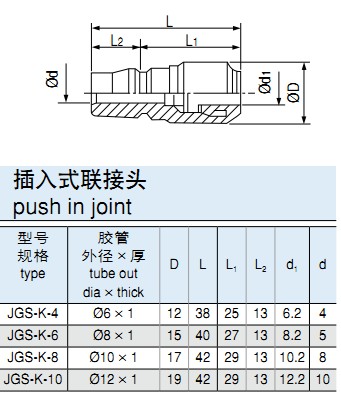 型號(hào)規(guī)格說(shuō)明,下圖例JGS-W-6A(JGS-K-6B)插入式外螺紋接口。高性能快速接頭,外插式內(nèi)螺紋接口。