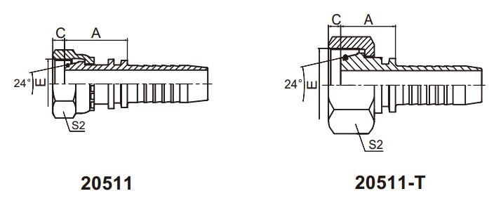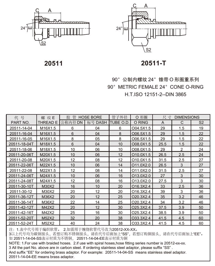 20511 90°公制內螺紋24°錐帶O形圈重系列 扣壓式軟管接頭