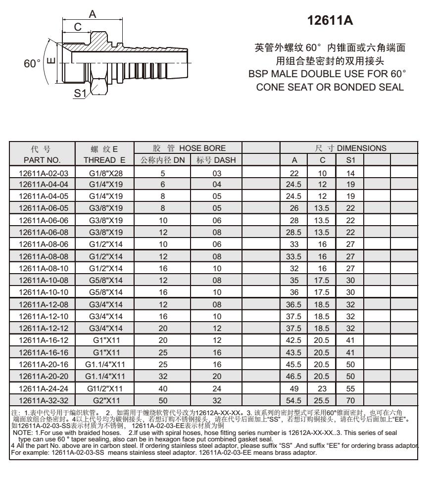 12611A 英管外螺紋60°內(nèi)錐面或六角端面用組合墊密封的雙用接頭