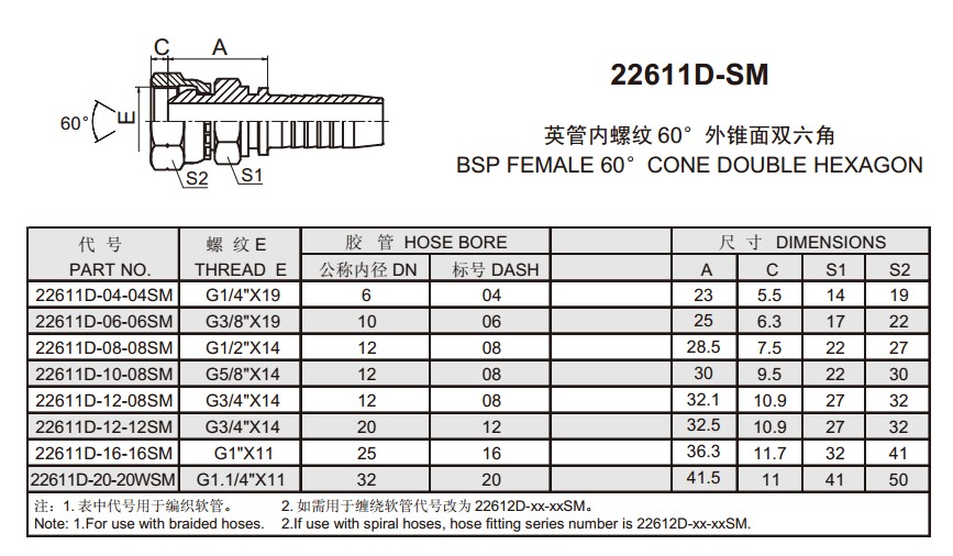 22611D-SM 英管內(nèi)螺紋60°外錐面雙六角
