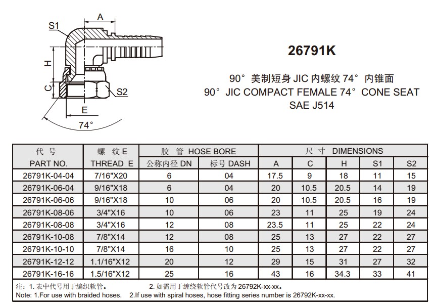26791K 90°美制短身JIC內螺紋74°內錐面