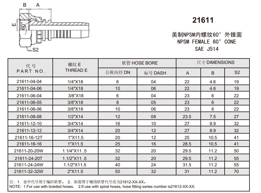 21611 美制NPSM內(nèi)螺紋60°外錐面