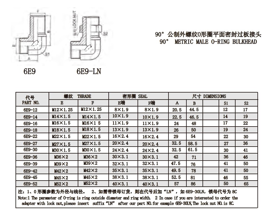 6E9 6E9-LN 90°公制外螺紋O形圈平面密封過(guò)板接頭