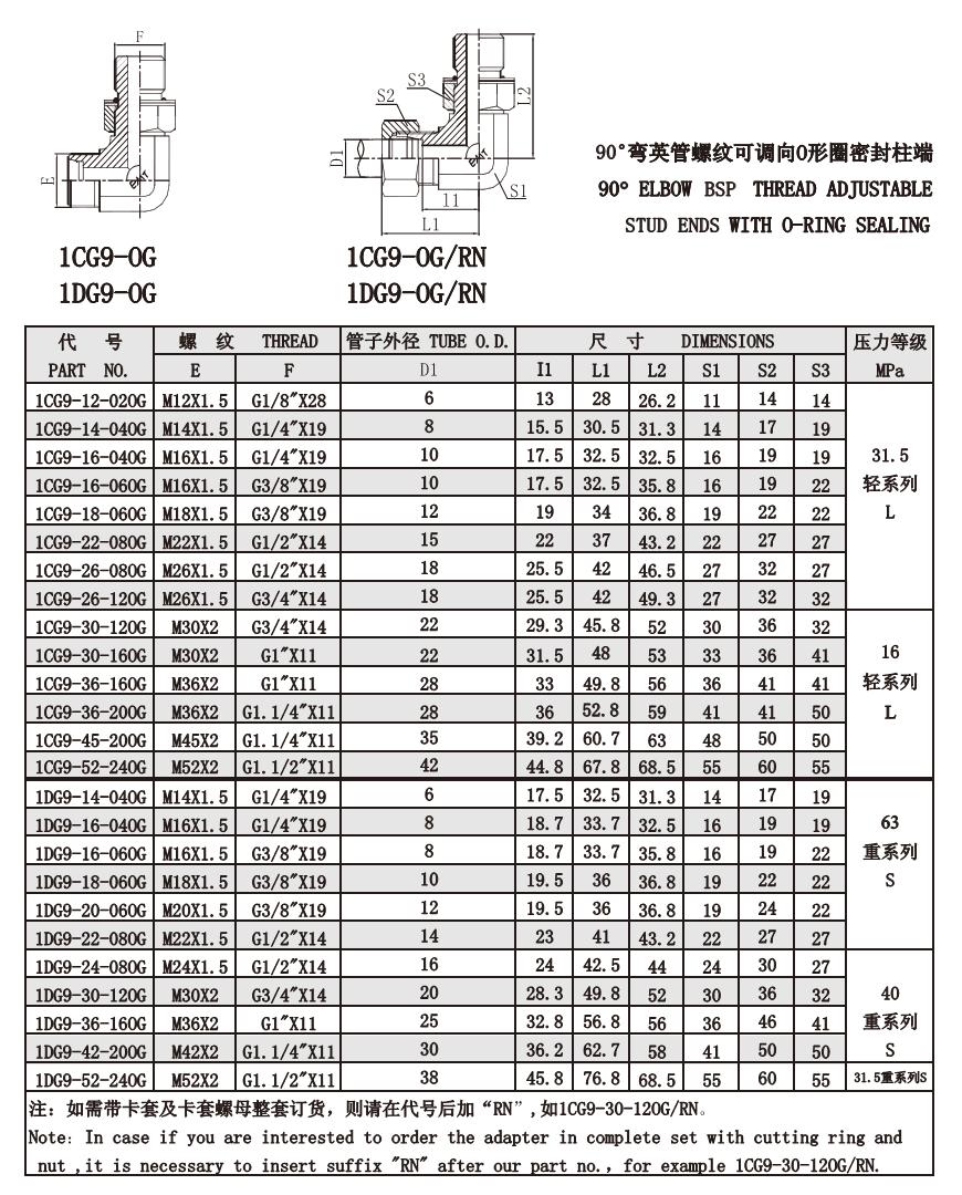 1CG9-OG 1DG9-OG 90°彎英錐管螺紋可調(diào)向柱端ISO 6149