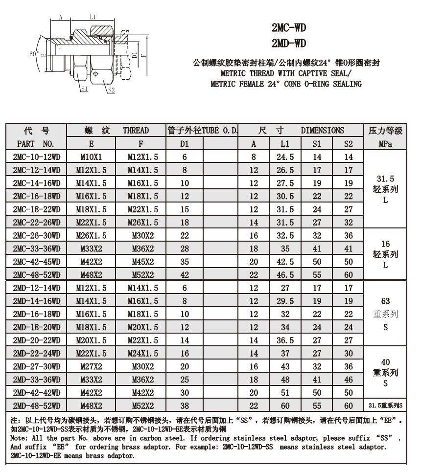 2MC-WD 2MD-WD 公制螺紋膠墊密封柱端/公制內(nèi)螺紋24°錐O形圈密封