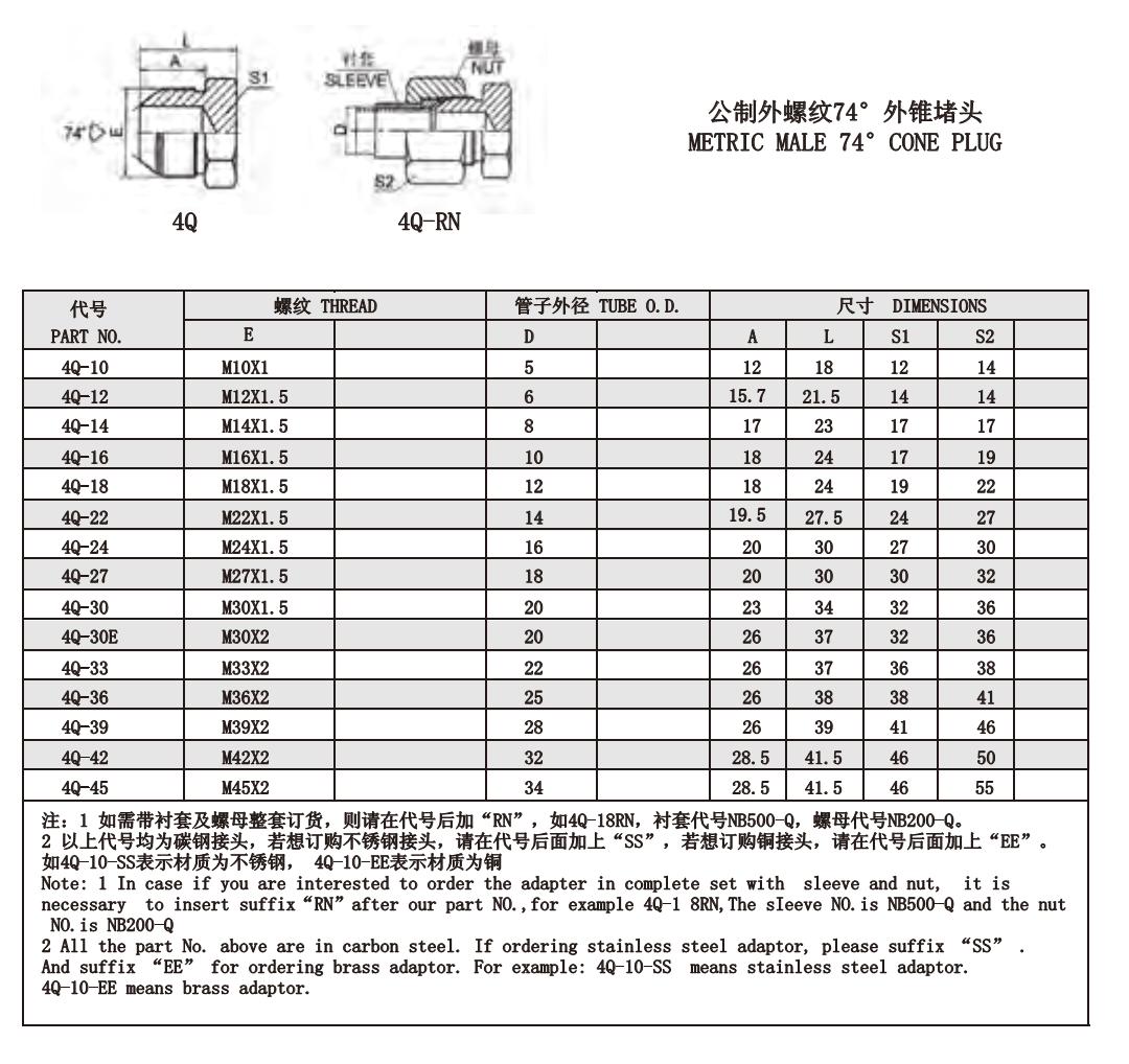 4Q 4Q-RN 公制外螺紋74°外錐堵頭
