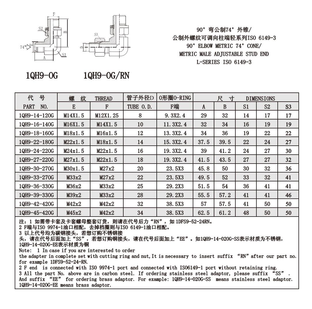 1QH9-OG 1QH9-OG/RN 90°彎公制74°外錐/公制外螺紋可調(diào)向柱端輕系列ISO 6149-3