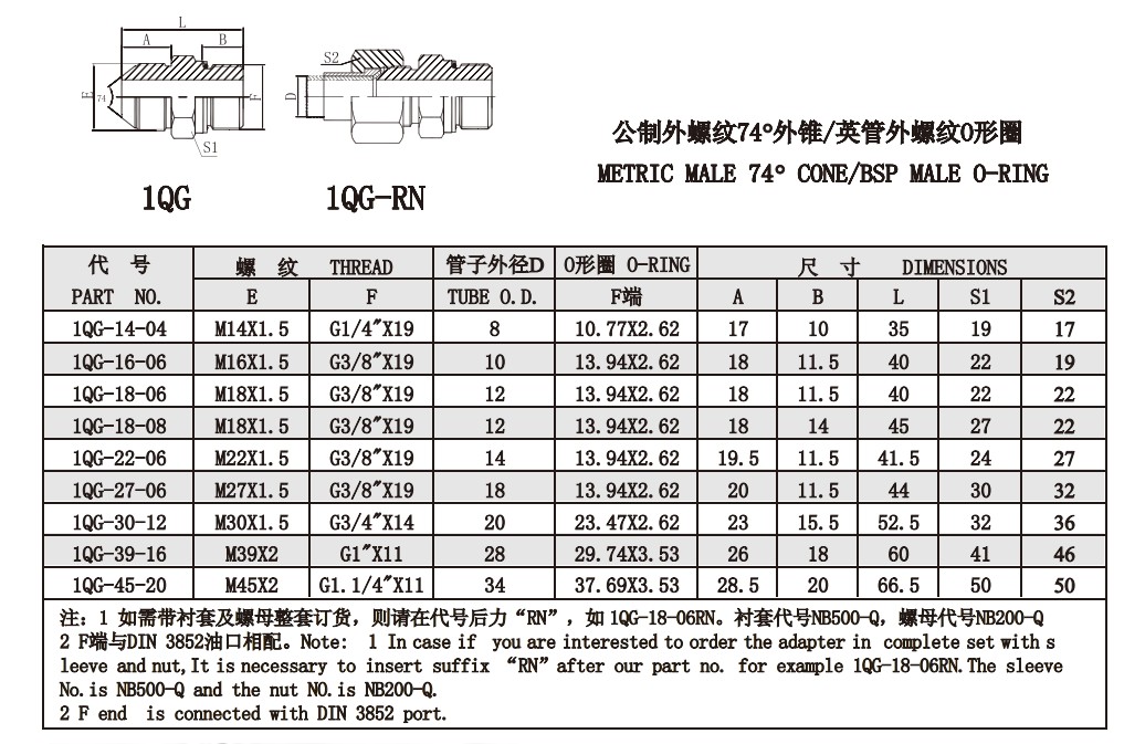 1QG 1QG-RN 公制外螺紋74°外錐/英制外螺紋O型圈
