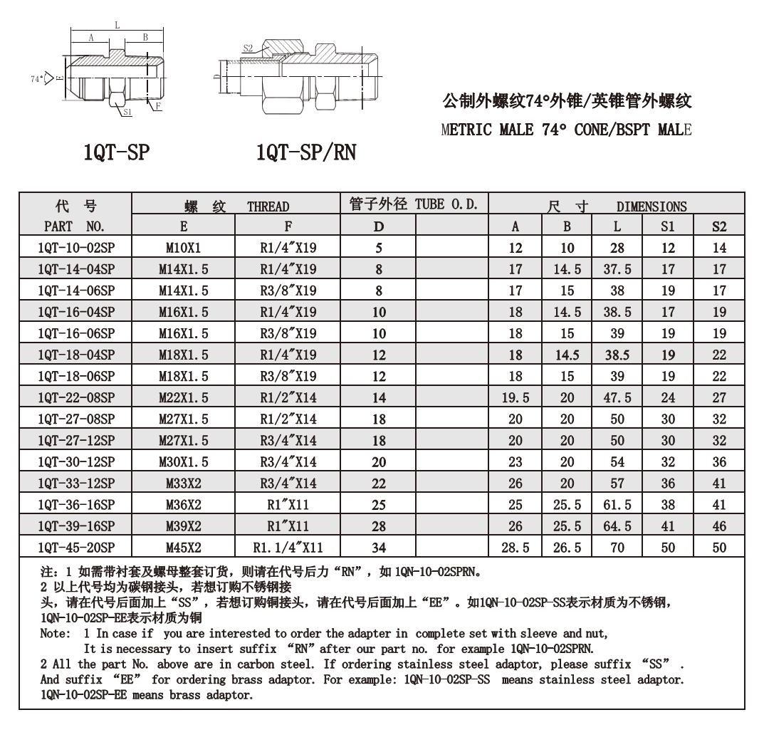 1QT-SP 1QT-SP/RN 公制外螺紋74°外錐/英錐管外螺紋