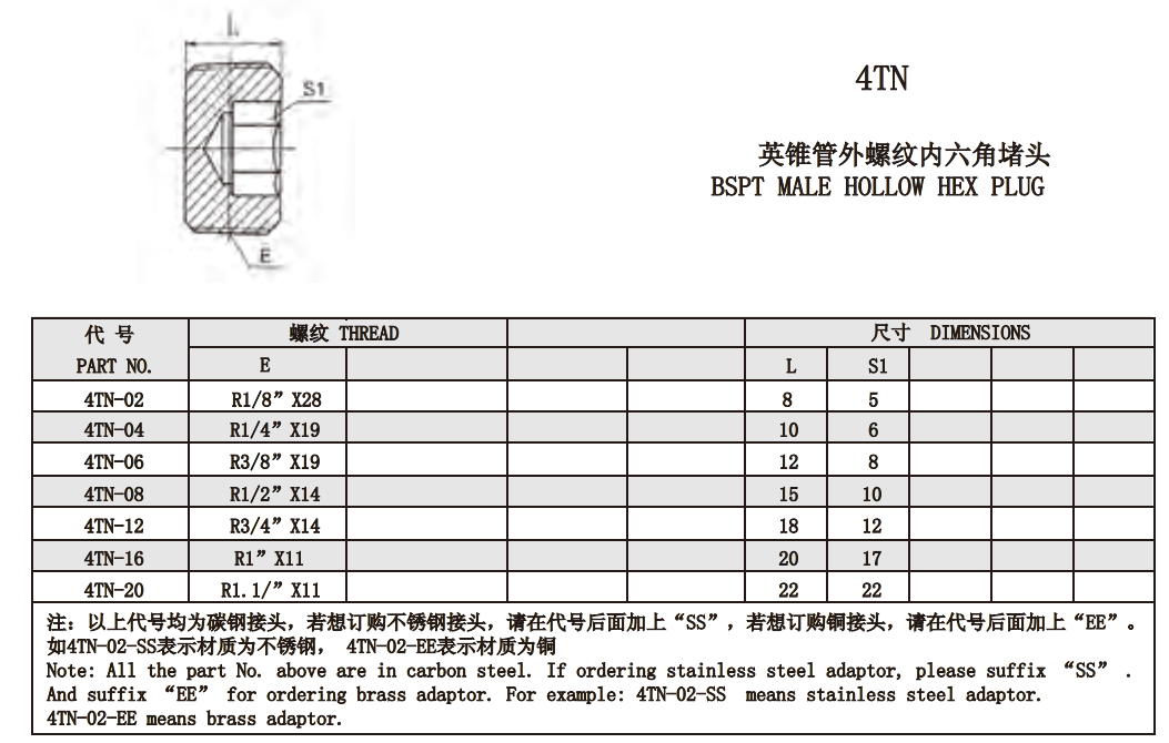 4TN 英錐管外螺紋內(nèi)六角堵頭