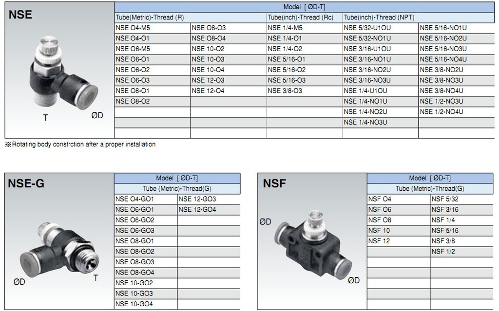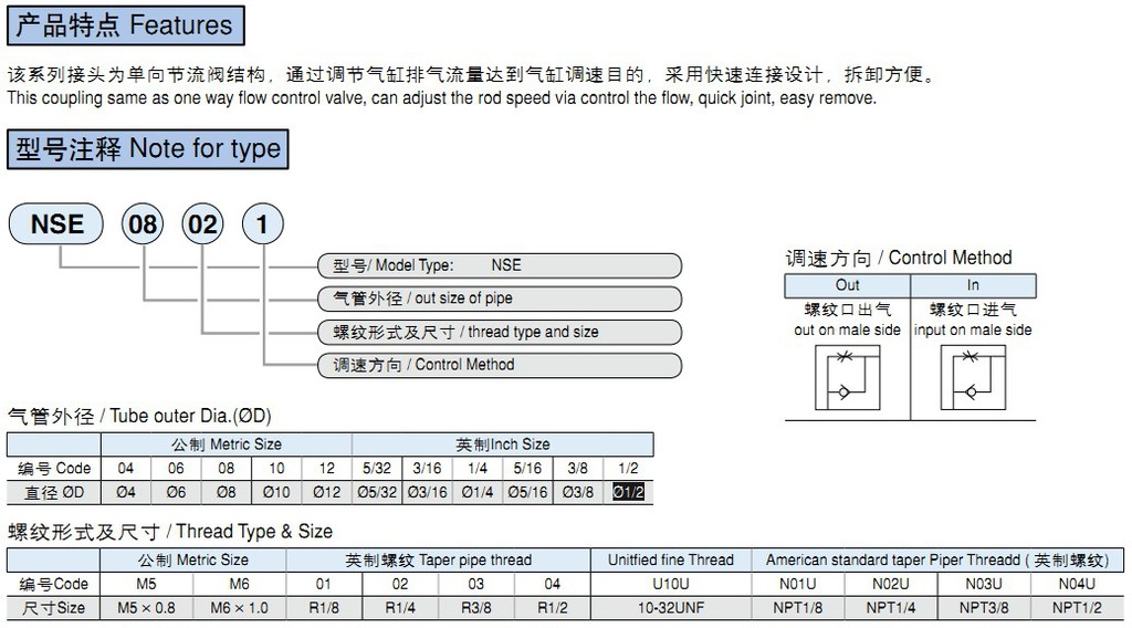 氣動(dòng)接頭 快插式 NSE系列,為單向節(jié)流閥結(jié)構(gòu),通過調(diào)節(jié)氣缸排氣流量達(dá)到氣缸調(diào)速目的,采用快速連接設(shè)計(jì),拆卸方便。
