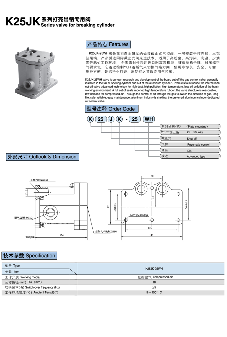 K25JK 系列打殼出鋁專(zhuān)用閥產(chǎn)品特點(diǎn): K25JK-25WH閥是我司自主研發(fā)的板接截止式氣控閥,一般安裝于打殼缸、出鋁缸尾端。產(chǎn)品引進(jìn)國(guó)際截止式閥先進(jìn)技術(shù),適用于高粉塵、高污染、高溫、少油霧等惡劣工作環(huán)境, 全套密封件采用進(jìn)口耐高溫橡膠,該閥結(jié)
