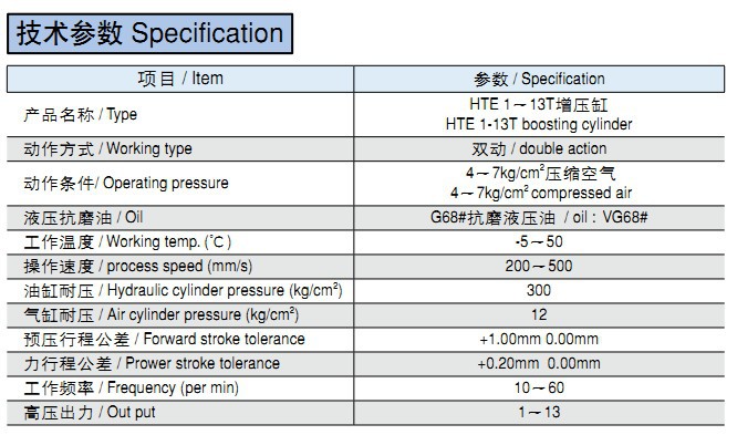 技術(shù)參數(shù) Specification項(xiàng)目 / Item 參數(shù) / Specification產(chǎn)品名稱 / TypeHTE 1~13T增壓缸HTE 1-13T boosting cylind