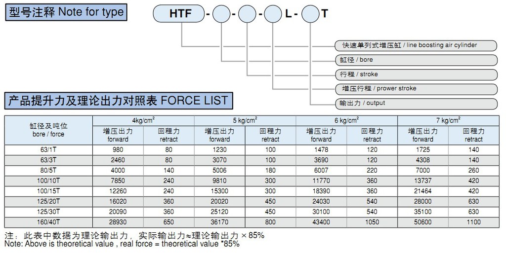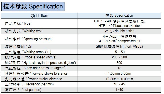 技術(shù)參數(shù) Specification項目 Item 參數(shù) Specification產(chǎn)品名稱 / TypeHTF 1~40T快速單列式增壓缸HTF 1-40T boosting cylinder&l