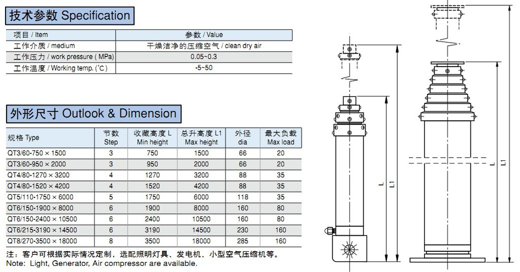 單作用多級升縮氣缸QT系列可按要求非標(biāo)定制