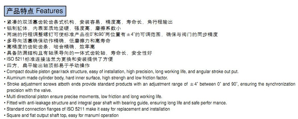 • 緊湊的雙活塞齒輪齒條式機(jī)構(gòu),安裝容易,精度高,壽命長(zhǎng),角行程輸出