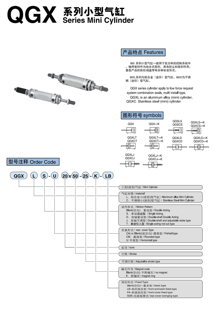 QGXL系列小型氣缸,采用鋁材質缸體,輕便靈活,動作可靠。 工作壓力:1-9.0MPa,保證耐壓力:13.5,緩沖形式:緩沖墊片,環(huán)境溫度:0-70℃,活塞運動速度:50-800mm/s,工作介質:干燥潔凈含油霧的壓縮空氣缸