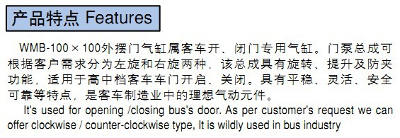 WMB-100×100外擺門(mén)氣缸屬客車(chē)開(kāi)、閉門(mén)專(zhuān)用氣缸。門(mén)泵總成可根據(jù)客戶(hù)需求分為左旋和右旋兩種,該總成具有旋轉(zhuǎn)、提升及防夾功能,適用于高中檔客車(chē)車(chē)門(mén)開(kāi)啟、關(guān)閉。具有平穩(wěn)、靈活、安全可靠等特點(diǎn),是客車(chē)制造業(yè)中的理想氣動(dòng)元件。