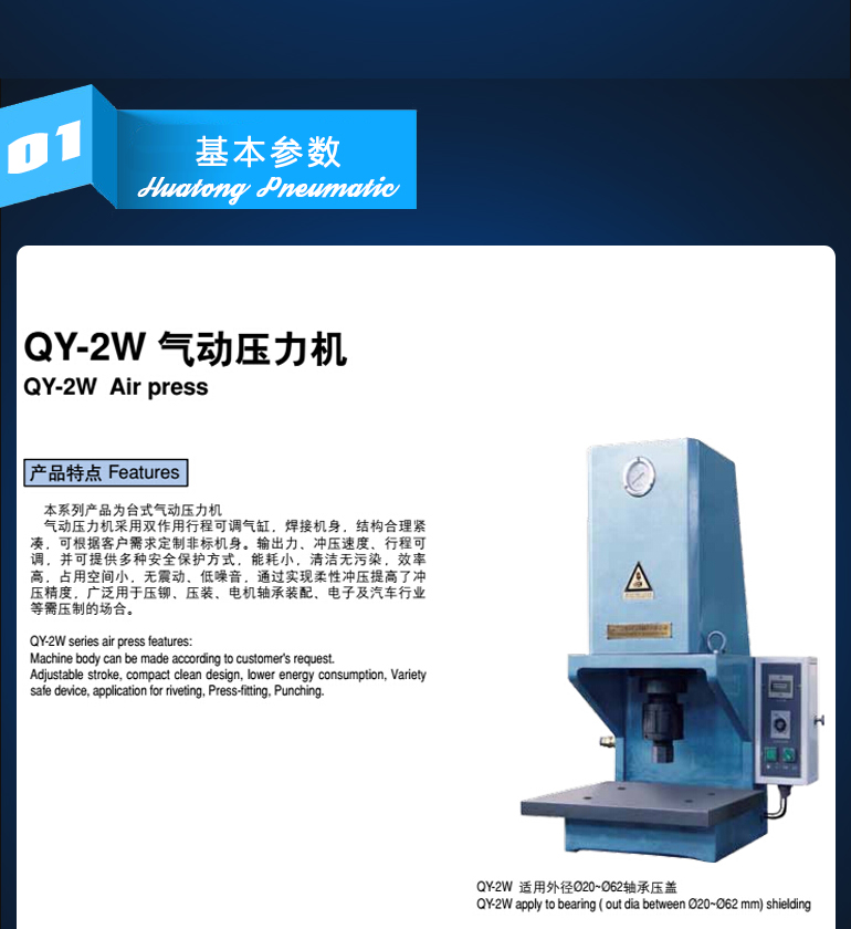 本系列產(chǎn)品為臺式氣動壓力機/氣動沖床。氣動壓力機/氣動沖床采用雙作用行程可調(diào)氣缸,焊接機身,結(jié)構(gòu)合理緊湊,可根據(jù)客戶需求定制非標機身。輸出力、沖壓速度、行程可調(diào),并可提供多種安全保護方式,能耗小,清潔無污染,效率高,占用空間小,無震動、低噪音。