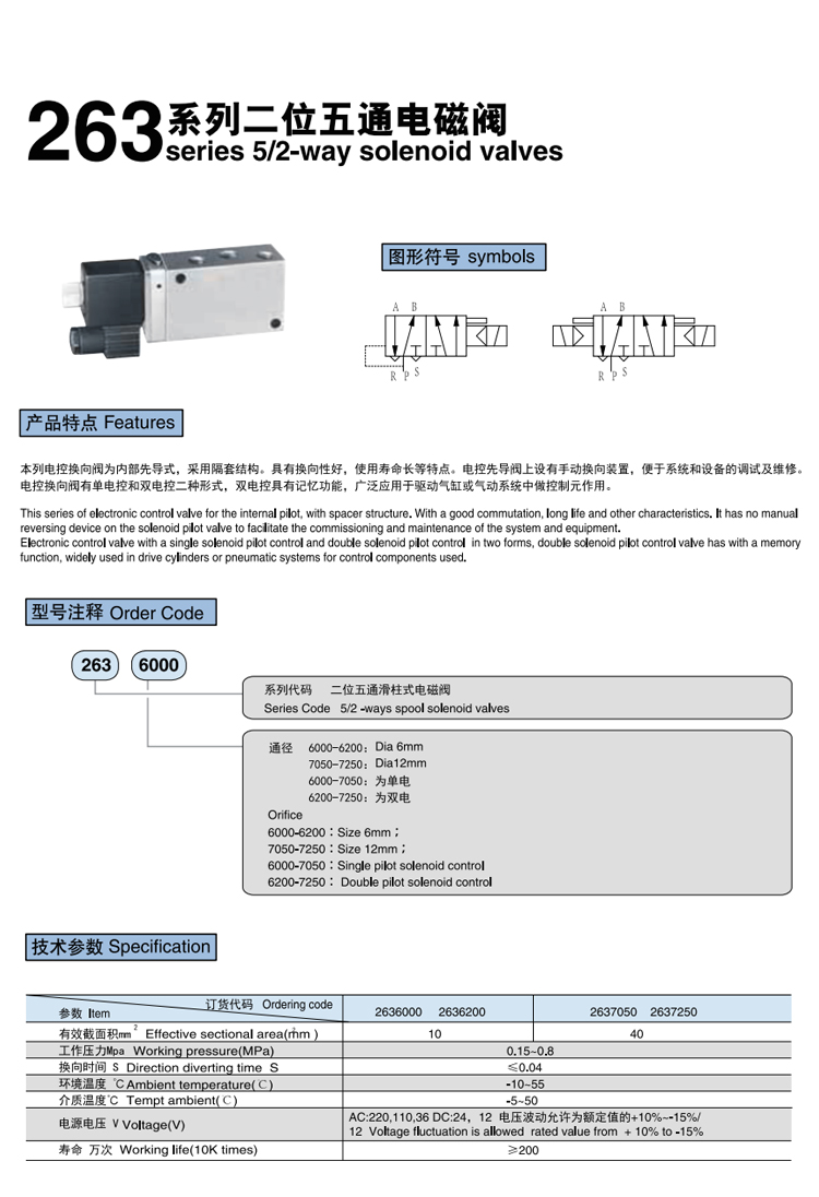 2636000.2637050 solenoid directional valves are widely used for pneumatic auto control systems in small installution space with good working conditions. When receiving electrical signals they function to quickly switch air directions to achieve auto control.