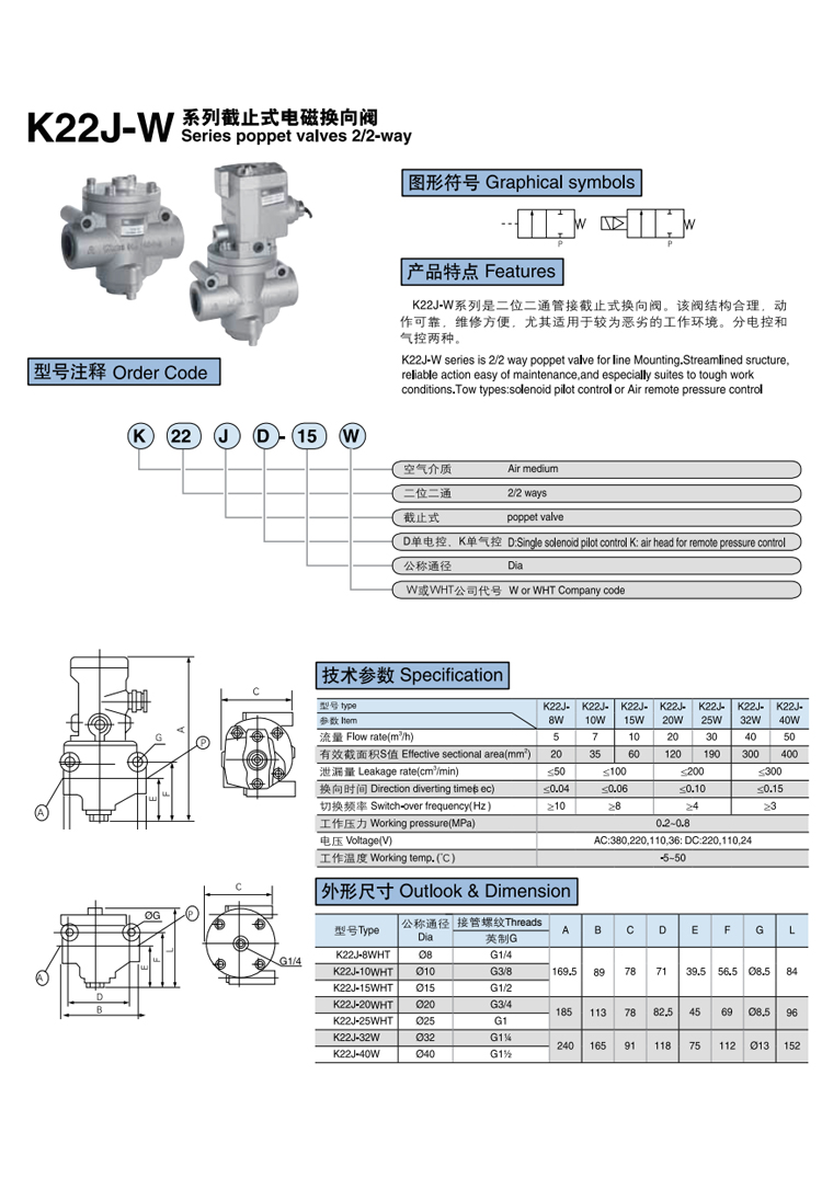 K22JD-WF系列截止式電磁閥 K22JD-WF系列是二位二通管接截止式換向閥方頭無錫單聯(lián)閥。該閥結(jié)構(gòu)合理,動(dòng)作可靠,維修方便,尤其適用于較為惡劣的工作環(huán)境。分電控和氣控兩種。
