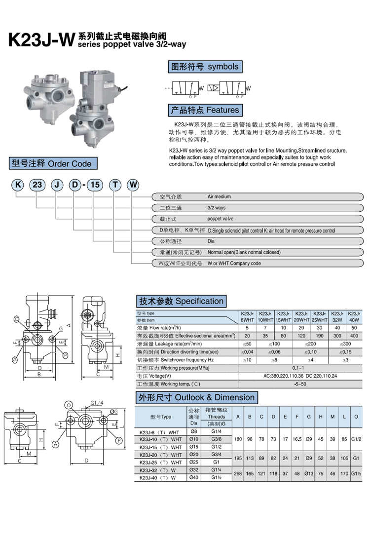 K23J-W系列 截止式電磁閥 產(chǎn)品特點 K23J-W系列是二位三通管接截止式換向閥。該閥結(jié)構(gòu)合理,動作可靠,維修方便,尤其適用于較為惡劣的工作環(huán)境。分電控和氣控兩種。圖形符號: 型號注釋:技術(shù)參數(shù): 公稱通徑mmØ6Ø8&Osl