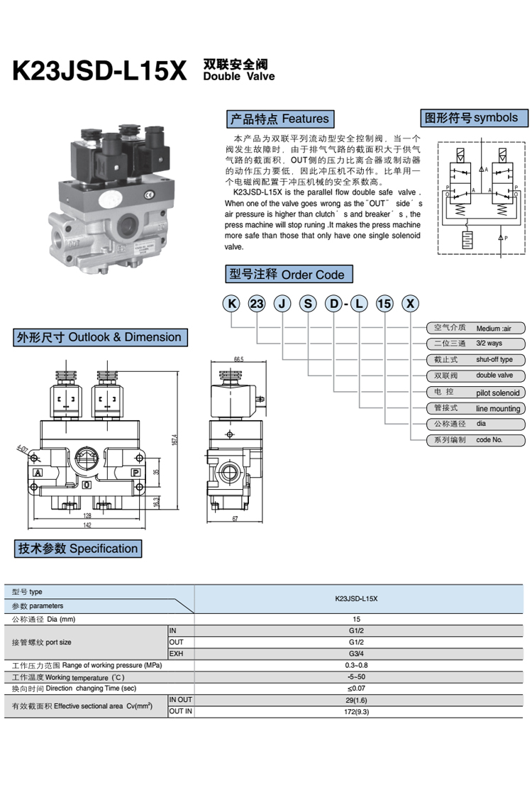 雙聯(lián)安全閥 K23JSD-L15X為雙聯(lián)平列流動型安全控制閥,當一個閥發(fā)生故障時,由于排氣氣路的截面積大于供氣氣路的截面積,OUT側(cè)的壓力比離合器或制動器的動作壓力要低,因此沖壓機不動作。比單用一個電磁閥配置于沖壓機械的安全系數(shù)高。