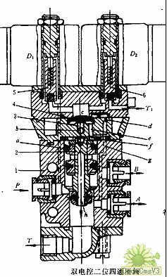圖4所示為先導式雙電控二位四通電磁換向閥。它由先導閥(Dl、D2)和主閥組成。而主閥又包括閥體1和活塞組件2兩部分。圖示的是Dl、D2均處于斷電的狀態(tài)。電磁閥的動鐵芯5、6處于關(guān)閉狀態(tài)。當Dl通電、D2斷電時,動鐵芯5被吸起,由P口來的壓縮空氣經(jīng)孔a(虛線)進入閥的f腔。并從密封塞4(單向閥)的四周唇邊進入孔‘,并進入。廣腔,推動活塞組件2下移,使P與A通,B經(jīng)閥芯中心孔h與T通(排氣)。A口有壓縮空氣輸出的同時,有一部分壓縮空氣流入孔g,其中一路經(jīng)節(jié)流孔d進入c腔使密封塞4下移封住排氣孔b,另一路壓縮空氣進入f腔,作用在活塞組件2的上端。此時,即使Dl斷電,活塞組件2也不會位即該閥具有記憶功能。