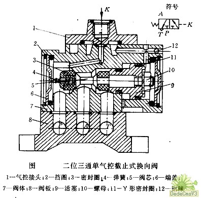 圖2所示為二位三通單氣控截止式換向閥的結(jié)構(gòu)圖。當K口無信號時。A與T通、閥處于排氣狀態(tài);當K口有信號輸入后,壓縮空氣進入活塞9的有端,使閥桿5左移、P與A通。圖中所示的為常斷型閥,如果P與T換接則成為常通型。